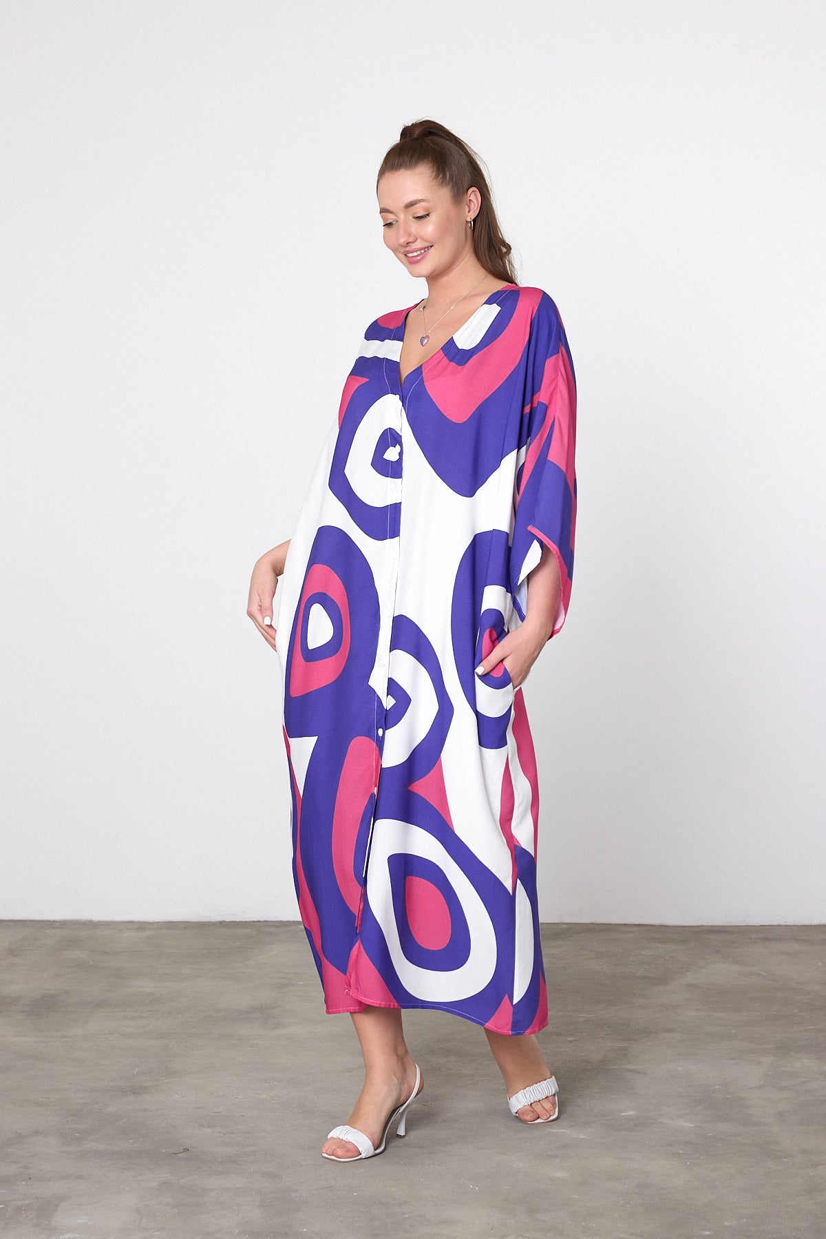 Flowy kaftan dress showcasing the Berry Wave Abstract Print in stunning purple, fuchsia, and white swirls. Features a loose fit, V-neckline, button-down front, and airy sleeves for comfort and elegance. Ideal for holiday wardrobes, boho boutiques, and beach-to-brunch looks.