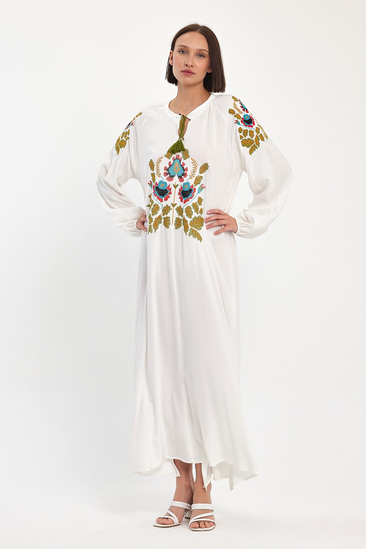 White maxi kaftan dress featuring vibrant Folk Garden Embroidery across the chest and sleeves. Designed with a loose-flowing fit, tassel-tie neckline, long sleeves, and side hem slit for comfortable movement. A fresh and elegant style ideal for summer, resort, and modest fashion wear.