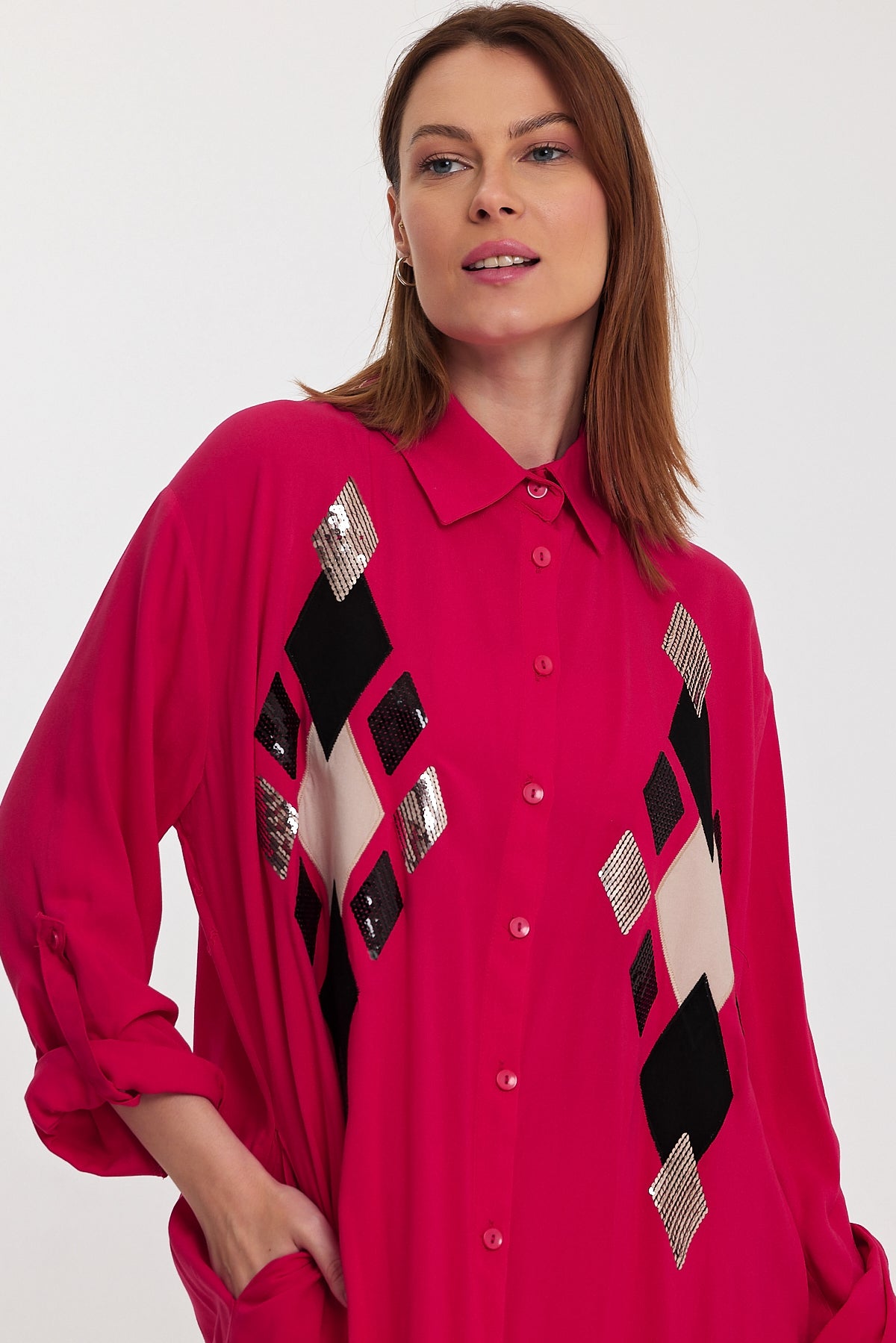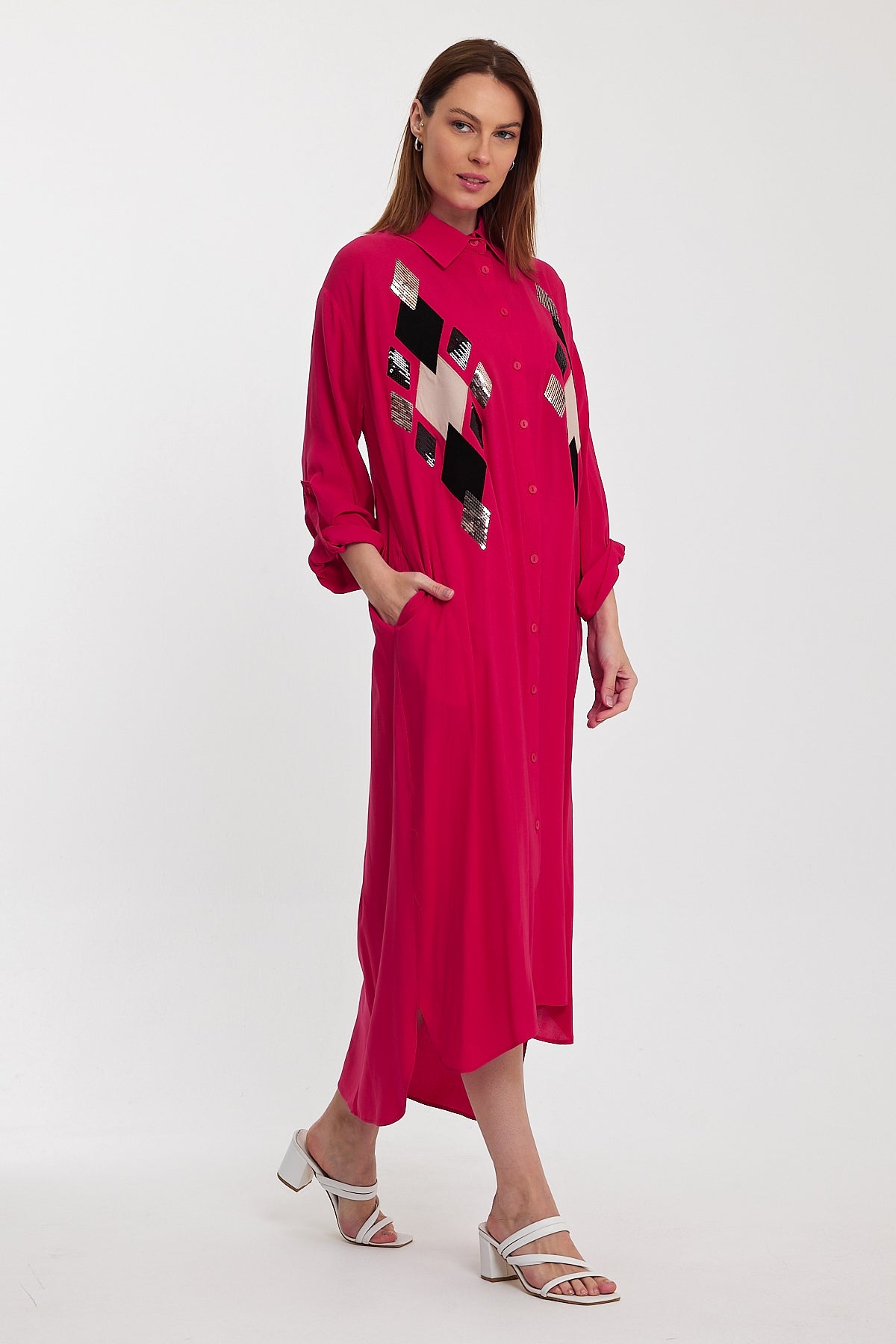Vibrant fuchsia button-down maxi shirt dress with a bold metallic diamond print in black, gold, and nude tones. Features a relaxed oversized silhouette, collared neckline, full button front, and side pockets for effortless comfort. Perfect for boutique resort wear, day-to-night looks, and modern modest styling.
