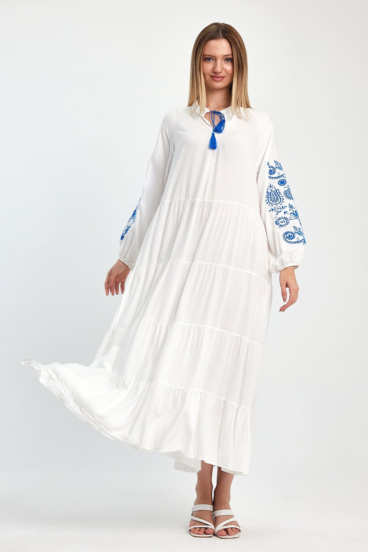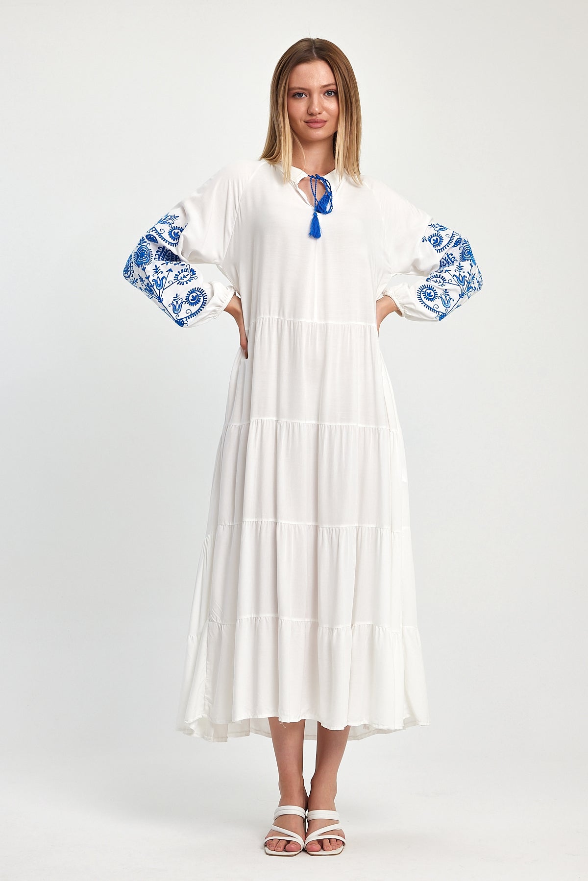 The Heritage Muse Embroidered Maxi Dress in white offers a modern twist on bohemian sophistication. Decorated with Boho Heritage Sleeve Embroidery in royal blue, it balances purity with personality. Its tiered silhouette and tassel tie-neck detail create a relaxed yet refined look, ideal for boutique resort or summer collections.