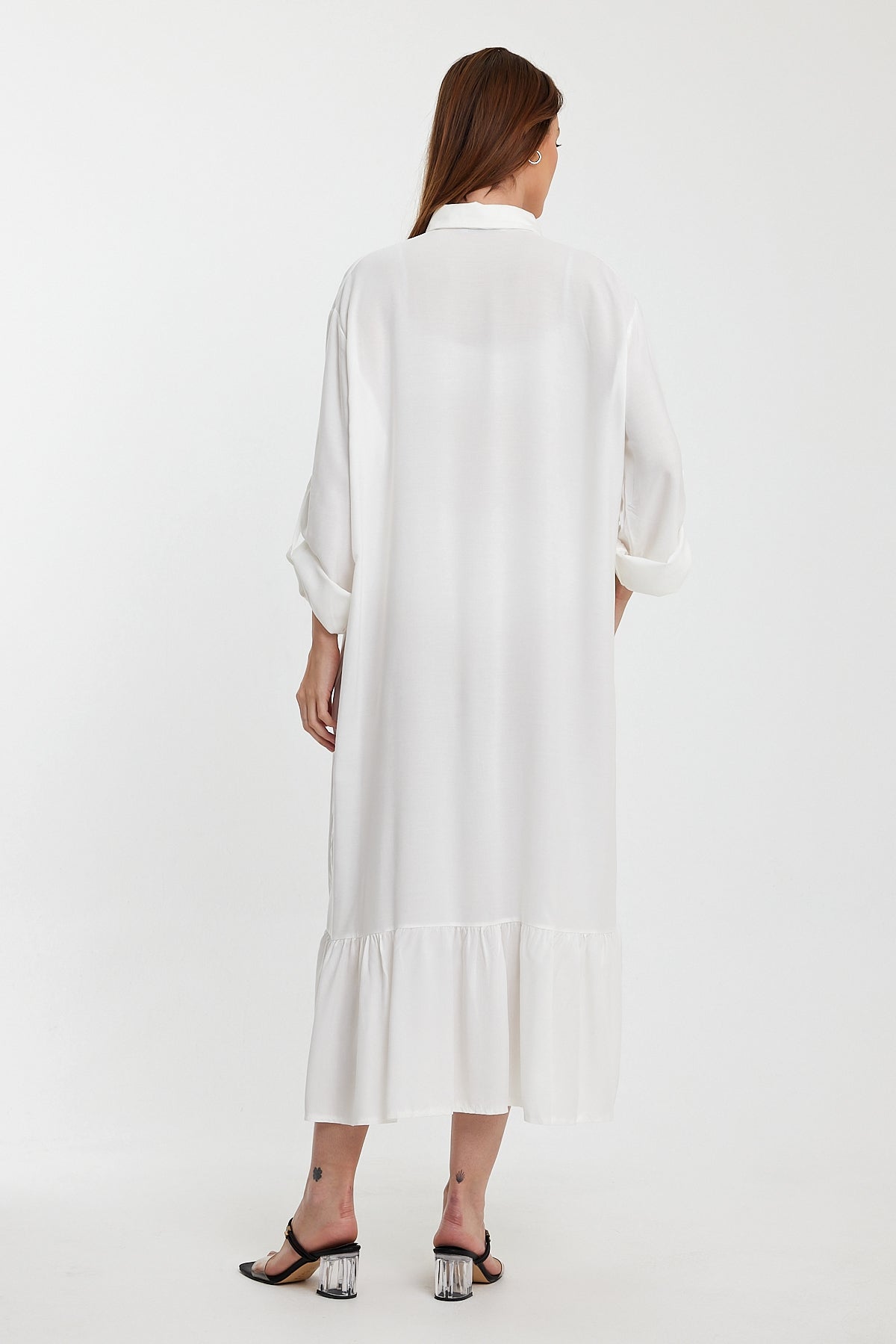 The Tribal Essence Shirt Dress in crisp white features striking Geometric Tribal Embroidery in vivid turquoise, pink, orange, and blue tones. Crafted in a relaxed, button-down silhouette with a flared hem, this piece brings together modern boho elegance and effortless comfort — ideal for boutique resortwear and summer collections.