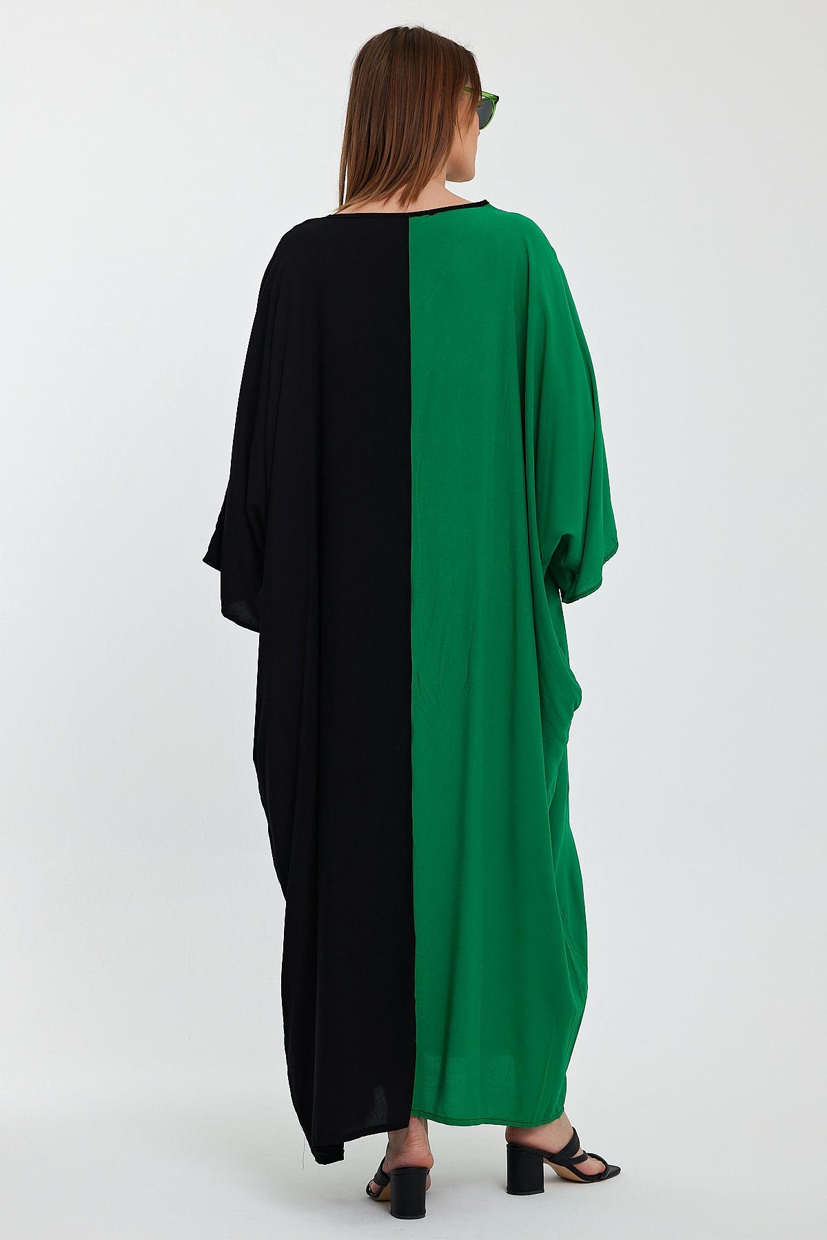 The Dual Charm Floral Kaftan Dress in green and black offers a sophisticated bohemian twist. Featuring Two-Tone Floral Contrast embroidery at the hem, it merges modern geometry with soft natural accents. Its relaxed, flowing cut makes it ideal for both casual and resort styling.
