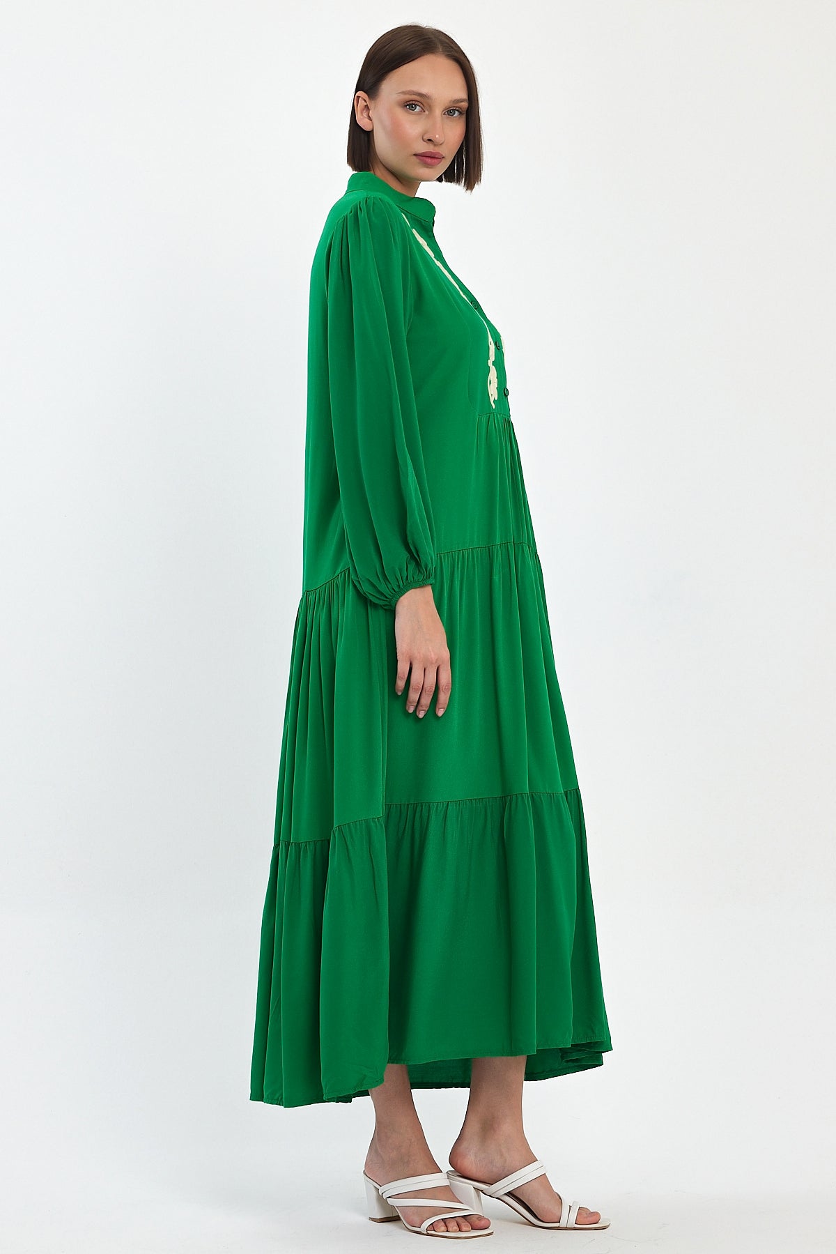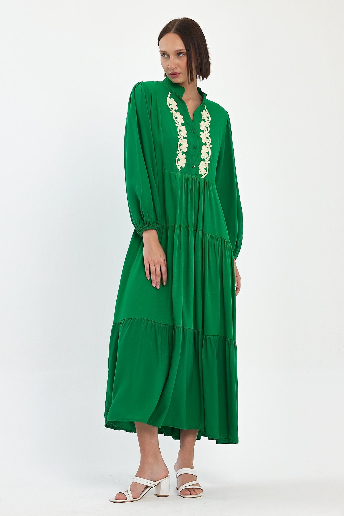 Sophisticated and timeless, the Ornate Elegance Maxi Dress in emerald green showcases exquisite Floral Appliqué Embroidery along the neckline and button placket. Designed with soft balloon sleeves, a tiered skirt, and a relaxed fit that flows beautifully — this piece blends elegance with comfort. Perfect for boutique resort collections, modest fashion, and summer events.