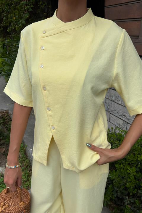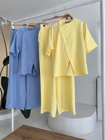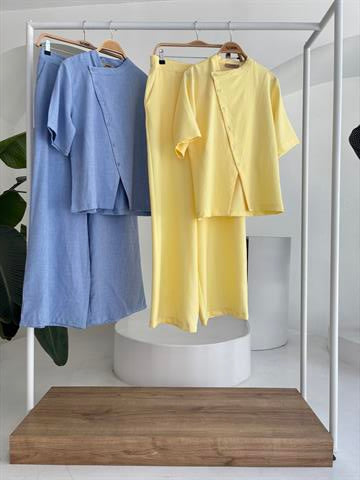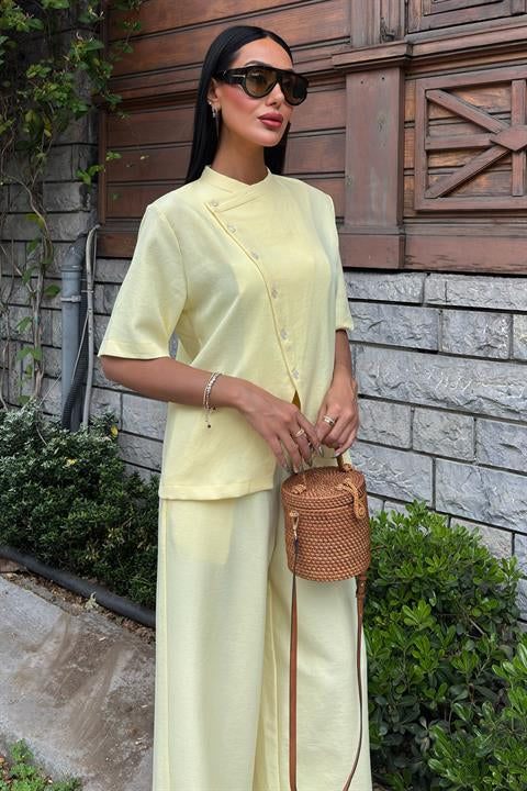 (6P.PACK) Hakim Yaka Çapraz Düğmeli Plazzo Pantolon Viscon Keten Takım 10209
